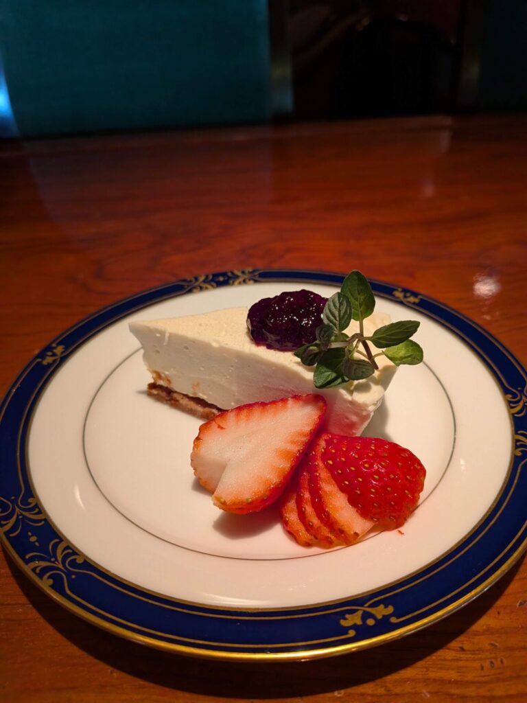 口当たりなめらかなレアチーズケーキに、ブルーベリーのジャムと季節のフルーツ、いちごを添えて。